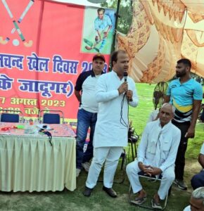 फोटो- हॉकी टूर्नामैंट के अवसर पर खिलाडियों को संबोधित करते करते वरिष्ठ कांग्रेसी नेता सुमित गौड।